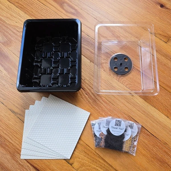 The kit includes a reusable nursery tray with a humidity dome, 5 organic compostable grow mats, and 5 organic microgreens seed packs listed above. JUST ADD WATER!